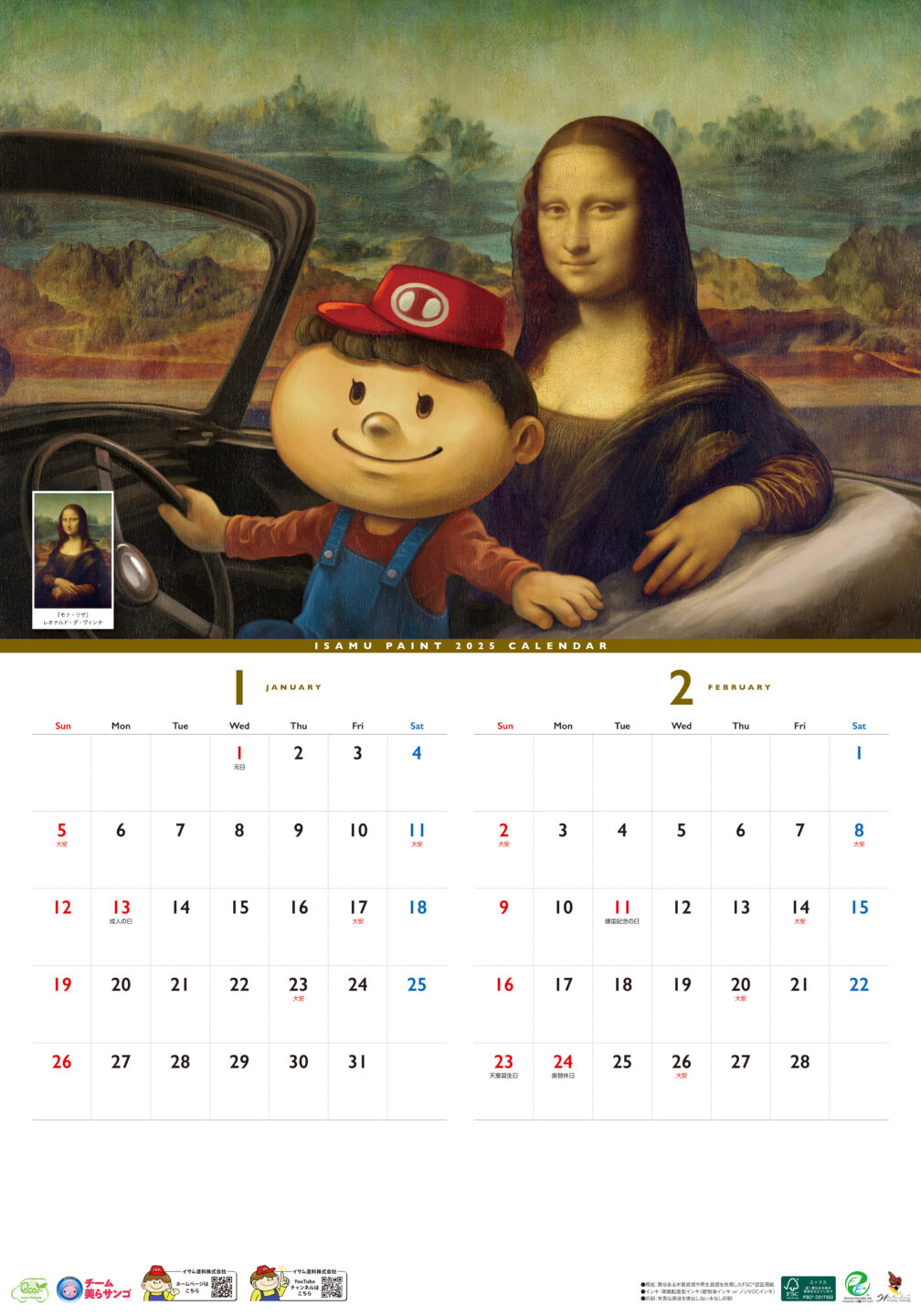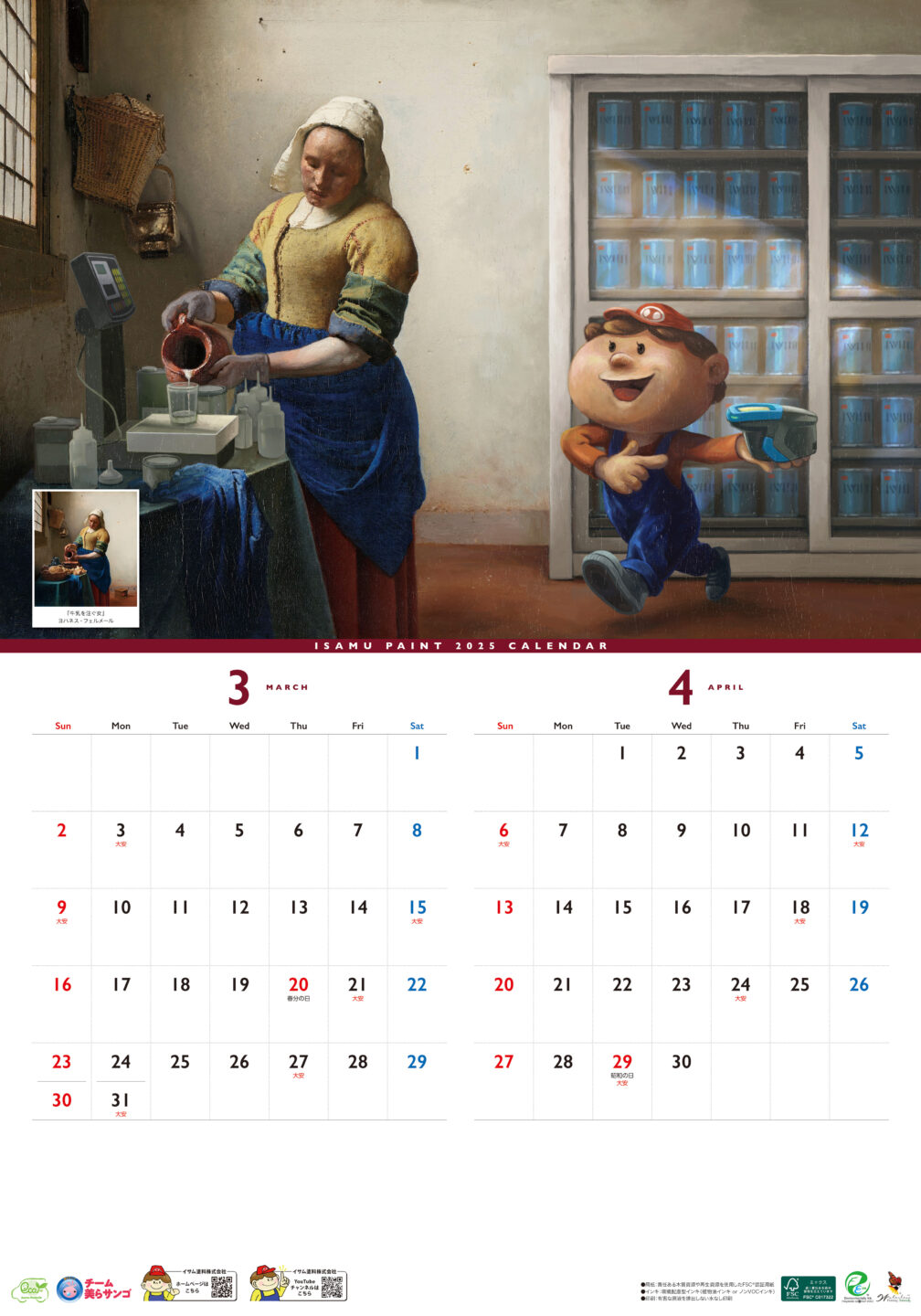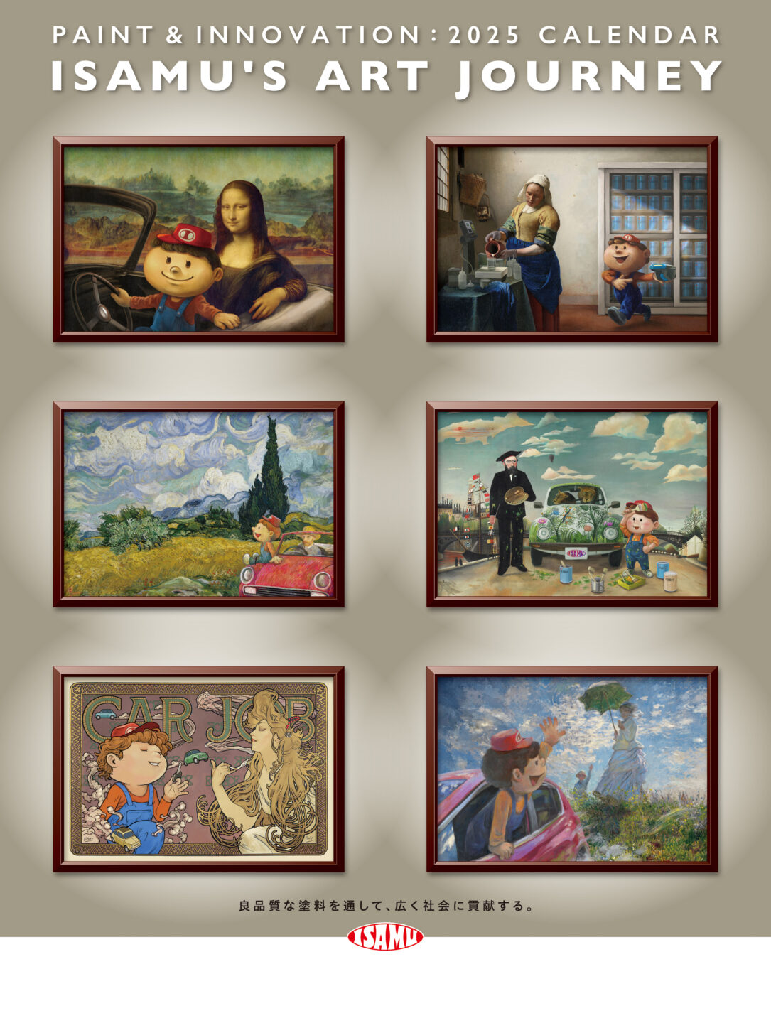 イサム塗料カレンダー2025年版のイラストを制作しました。マスコットキャラクター「イサムくん」が、さまざまな名画の世界を旅するシリーズです。それぞれの作品のタッチに合わせて、イサムくんの雰囲気も描き分けています。