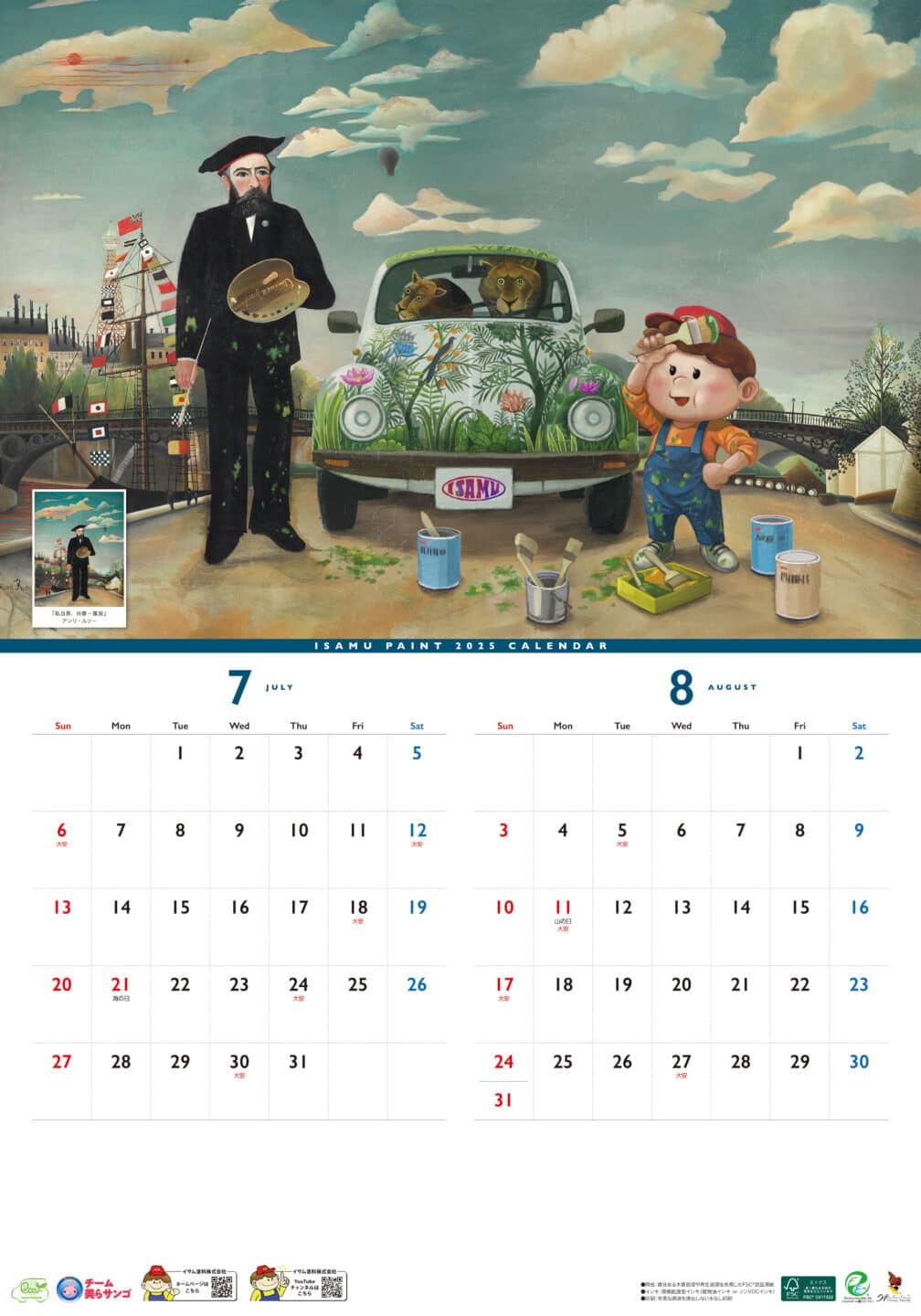 イサム塗料カレンダー2025年版のイラストを制作しました。マスコットキャラクターの「イサムくん」が、さまざまな名画の世界を旅するシリーズです。それぞれの絵画のタッチに合わせて、イサムくんの姿も描き分けています。