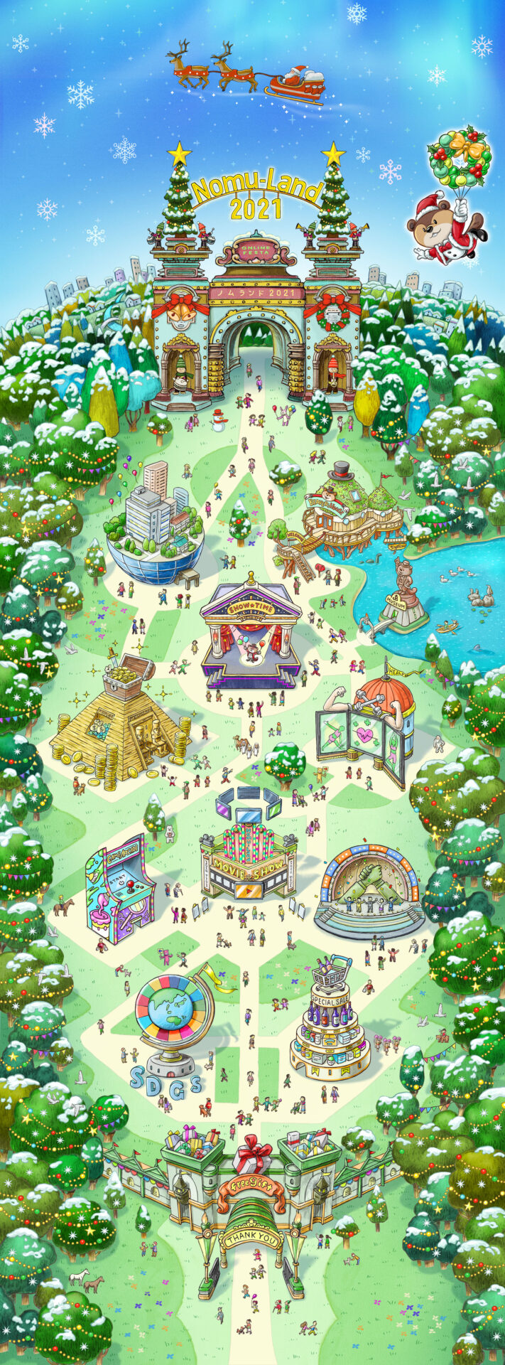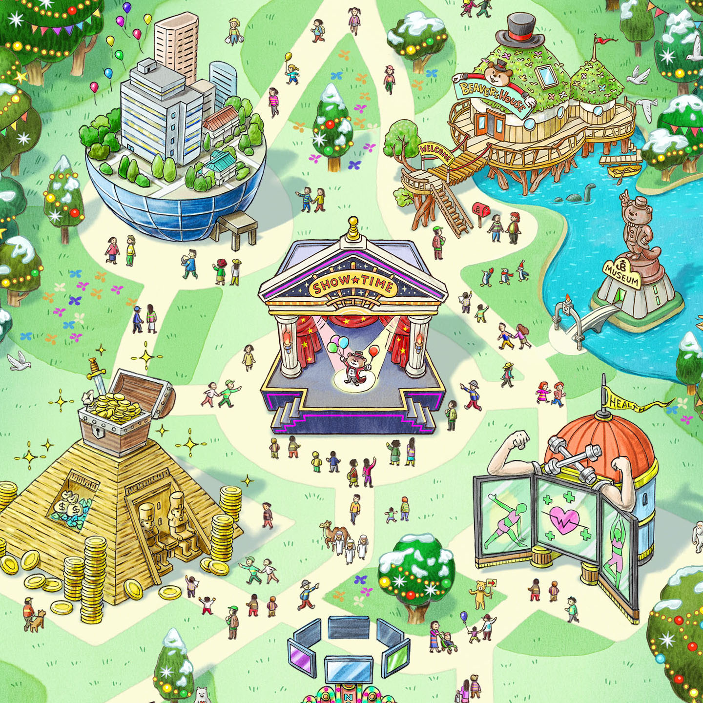野村不動産オンラインイベント用イラストマップ、キャラクターを制作しました。マップ上の建物がインタラクティブなページへの入口になっています。